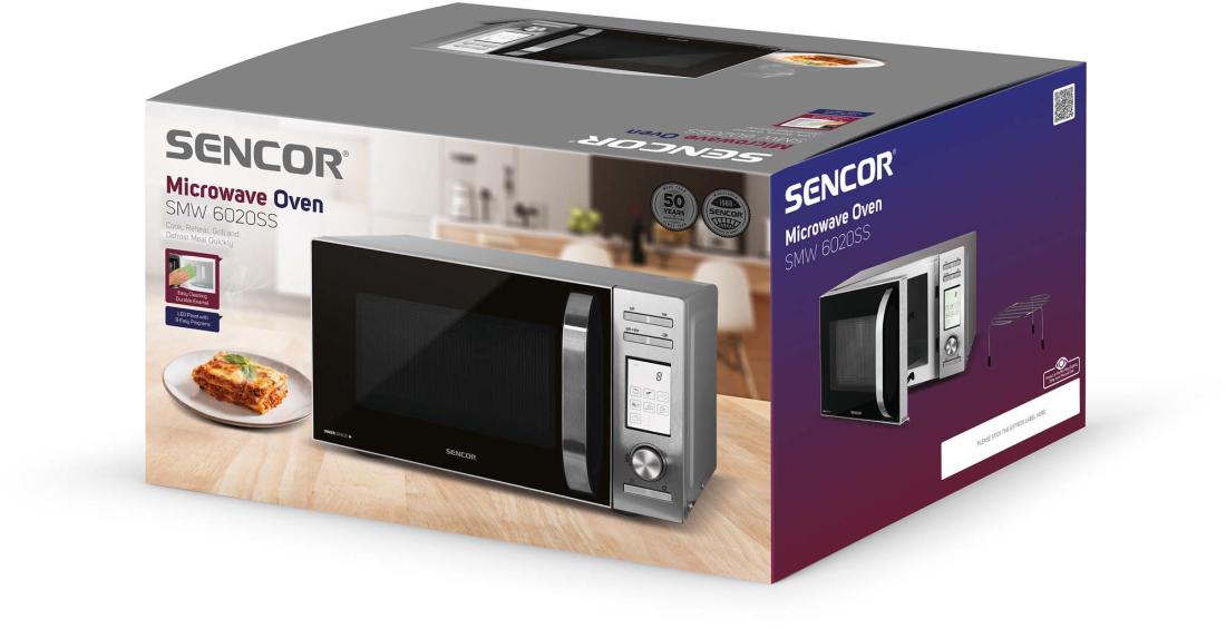 A Sencor SMW 6020SS egy letisztult, mégis elegáns megjelenésű szabadon álló mikrohullámú sütő. Az akár 700 W mikrohullámú és 900 W grillező teljesítményre képes készülék digitális vezérlésű. A 20 literes kapacitás mellett tíz különböző fokozattal lett felszerelve, továbbá elérhető a kiolvasztási funkció, valamint beépítésre került egy maximum 95 perces időzítő. A működtetését még egyszerűbbé teszi a 9 különböző beépített program. A mikró alapját jelentő forgótányér átmérője 245 mm.